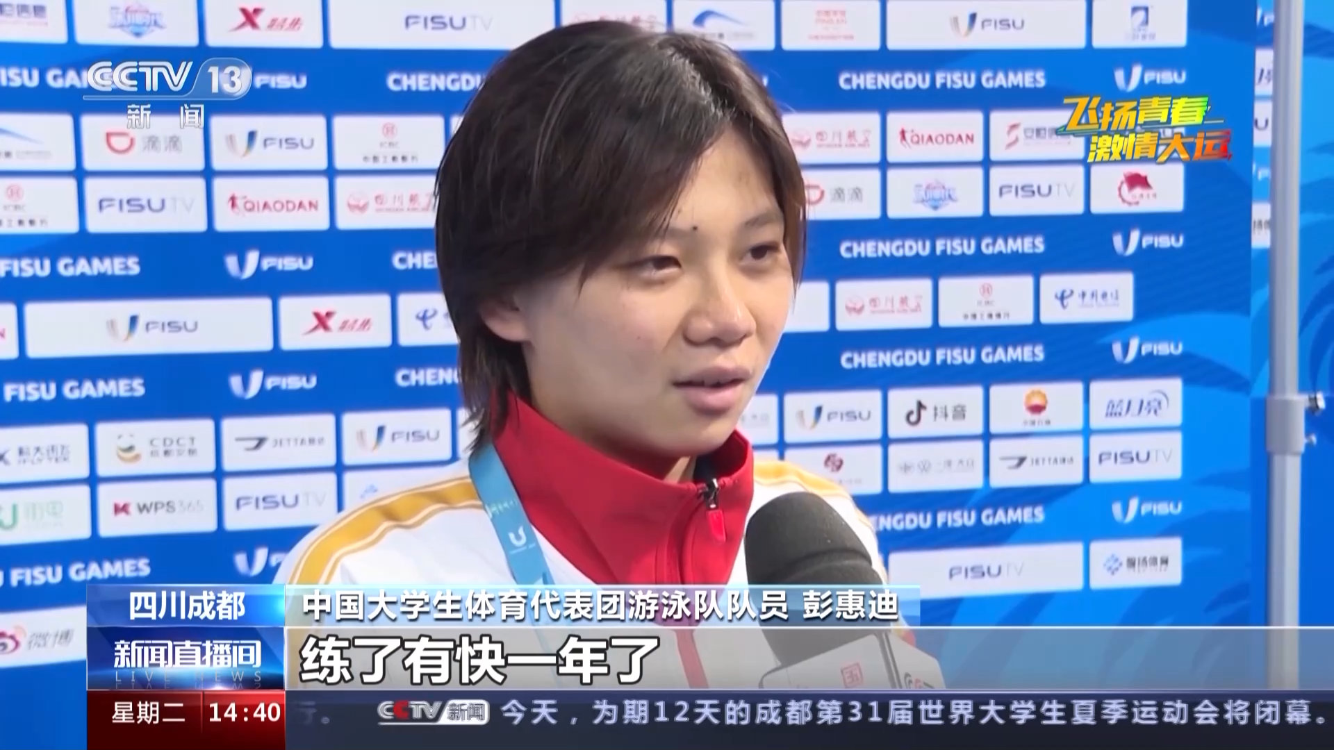 中国大学生体育代表团游泳队队员 彭惠迪:一边出发一边回头,练了有快一年了,因为要两者结合的话,它可能要更长时间去磨合的。和其他非听障运动员比赛竞争力更大,更激动一点,然后更能激发我的能力。