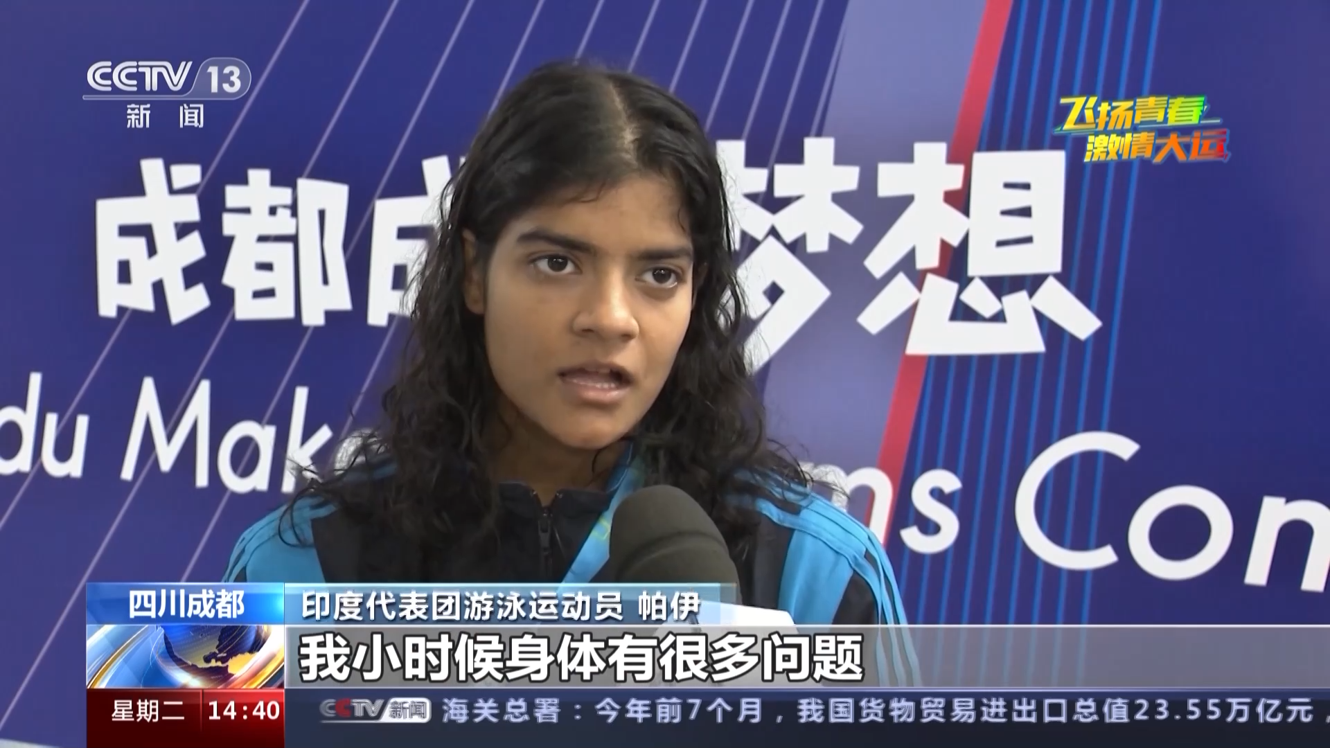 印度代表团游泳运动员 帕伊:我小时候身体有很多问题,心肺功能不好。所以我从四岁开始接触游泳,起初是为了锻炼我的心肺功能,这是我第一次参加大运会,在赛场我发挥得很好,取得了三项个人最好成绩。我还在为冲刺奥运会的泳道积极准备。