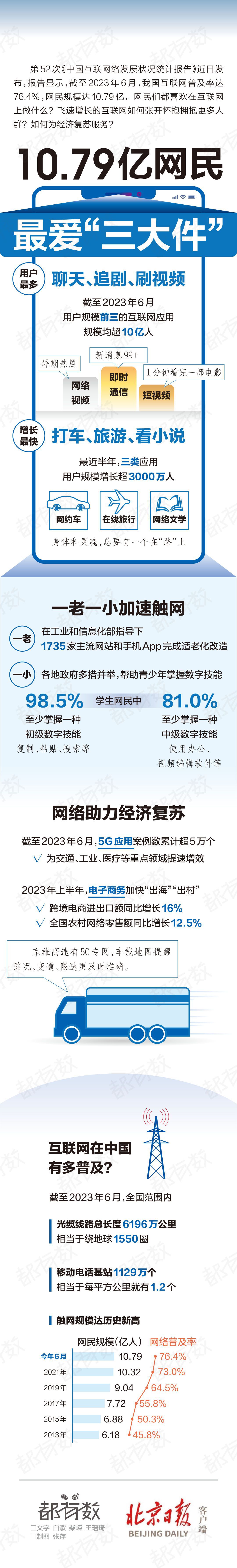 第52次《中国互联网络发展状况统计报告》近日发布,报告显示,截至2023年6月,我国互联网普及率达76.4%,网民规模达10.79亿。网民们都喜欢在互联网上做什么?飞速增长的互联网如何张开怀抱拥抱更多人群?如何为经济复苏服务?