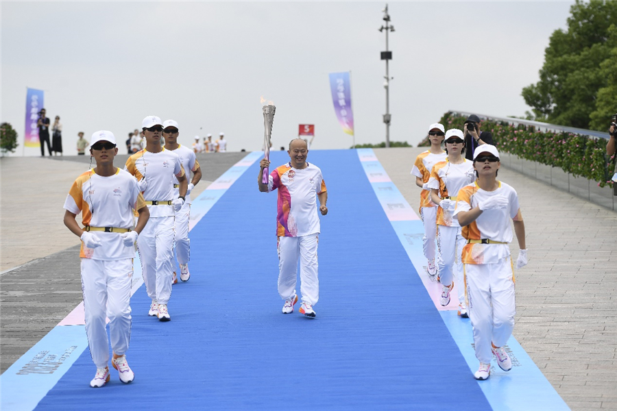 9时36分,火炬传递启动仪式正式开始。在《梦想天堂》和《动如潮》的音乐律动中,9点45分,第一棒火炬手羽毛球奥运冠军陈雨菲接过火炬,跑出舞台。
