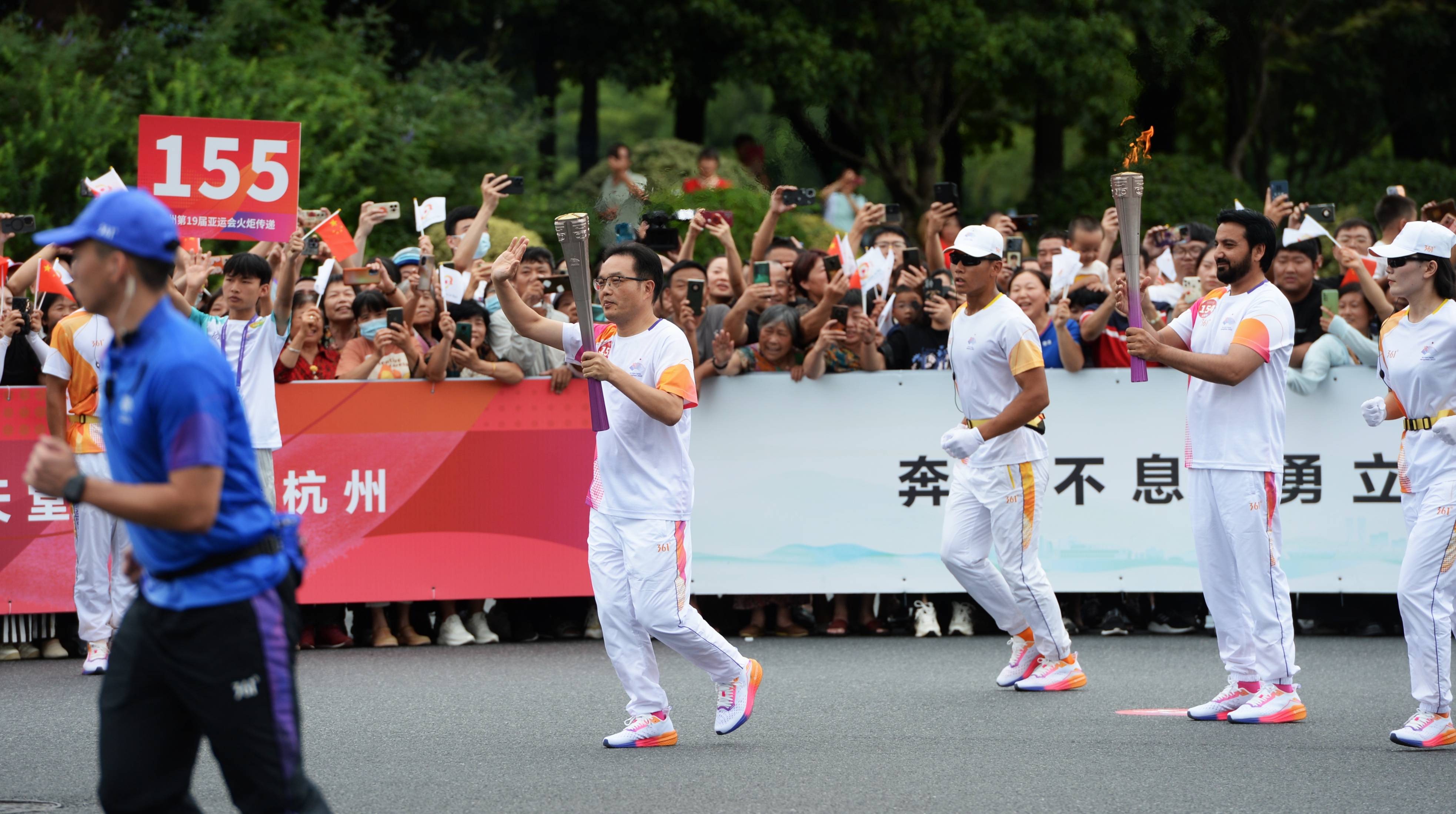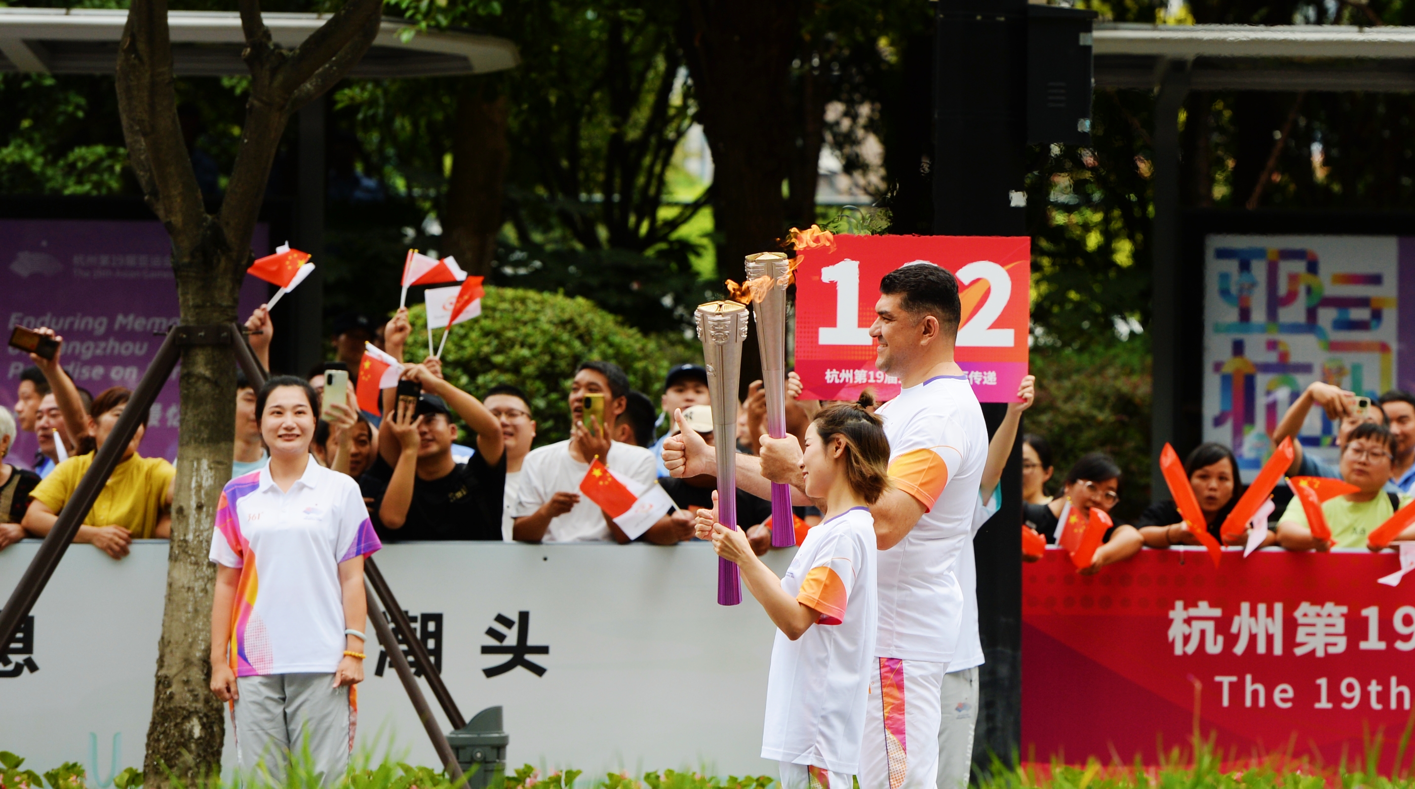 20日的火炬传递起跑仪式在杭州城市阳台举行。浙江省副省长、杭州第19届亚运会火炬传递指挥中心指挥长胡伟点燃火种盆,浙江省委常委、杭州市委书记、杭州第19届亚运会组委会副主席刘捷点燃杭州亚运会火炬“薪火”,交给本站第一棒火炬手陈雨菲,随后火炬传递来到物联网小镇、奥体中心、杭州国际博览中心,由203棒火炬手共同完成火炬传递。