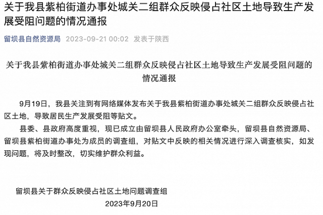 央视网消息:据留坝县自然资源局公众号消息,留坝县关于群众反映侵占社区土地问题调查组发布情况通报,9月19日,留坝县关注到有网络媒体发布关于留坝县紫柏街道办事处城关二组群众反映侵占社区土地,导致居民生产发展受阻等贴文。