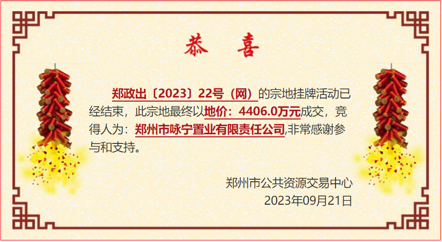 【大河财立方消息】9月21日,郑州市管城区出让1宗零售商业地块。最终,由郑州市咏宁置业有限责任公司以4406万元竞得,溢价6%。