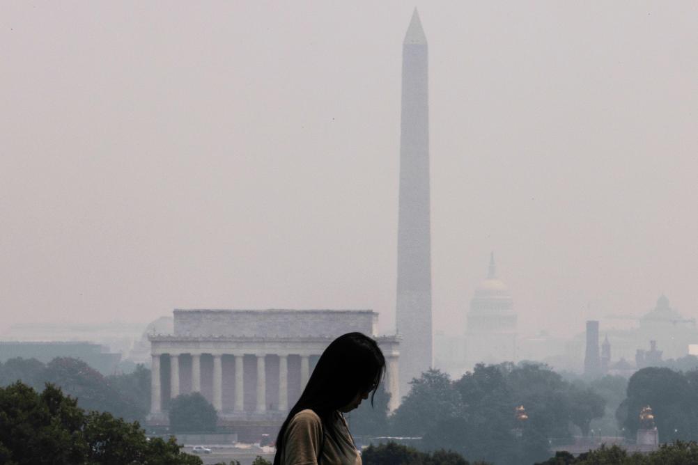 这是6月7日在美国弗吉尼亚州阿灵顿拍摄的烟尘笼罩下的林肯纪念堂、华盛顿纪念碑和国会。(新华社发,亚伦摄)