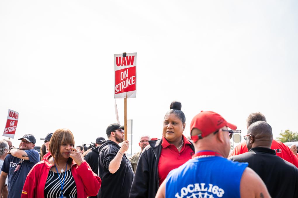 9月22日,在美国密歇根州贝尔维尔通用汽车部件厂外,车企工人参与罢工游行。(新华社发,瓦尔·沃勒摄)