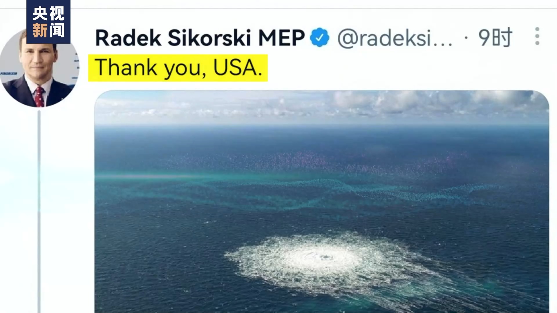 “北溪”事件事发前后的多种迹象,也加深了外界对美国的怀疑。早在2022年2月,俄乌冲突爆发前,美国总统拜登就曾信誓旦旦地对记者表示,美国自有办法可以终结“北溪”管道。2022年9月27日,也就是 “北溪”管道发生爆炸泄漏第二天,波兰前外长西科尔斯基在社交媒体转发了一条配有“北溪”管道事故现场图的推文,并附上了一句“谢谢你,美国”。