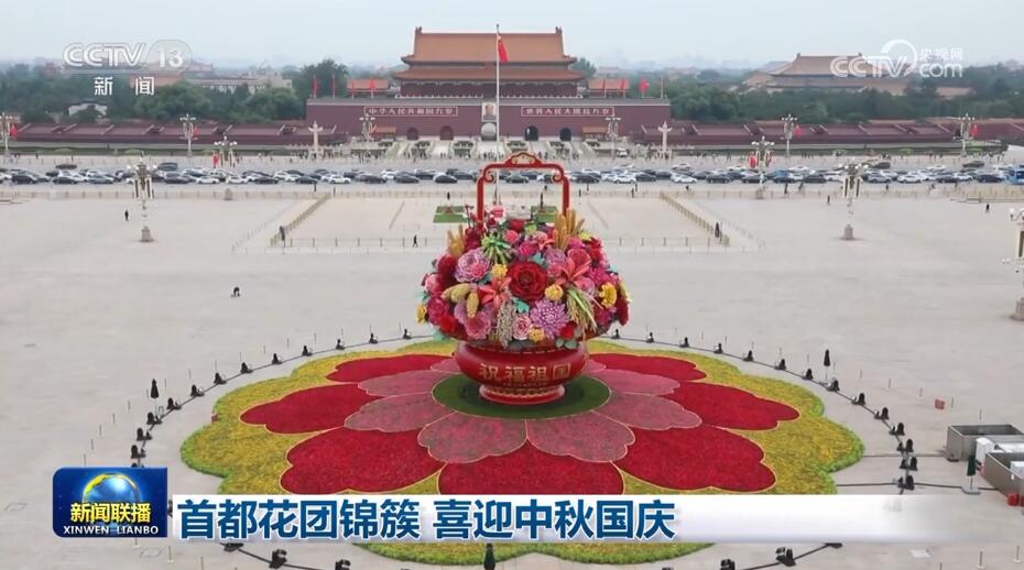 北京天安门广场和长安街沿线装扮一新,“祝福祖国”巨型花篮亮相天安门广场,一派喜庆的节日气氛。今年,天安门广场花篮首次引入象征丰收的五谷元素——水稻、小麦、小米、黄米、大豆,寓意五谷丰登。整个立体花坛顶高18米、底部直径45米,为牡丹图案,寓意繁荣昌盛。