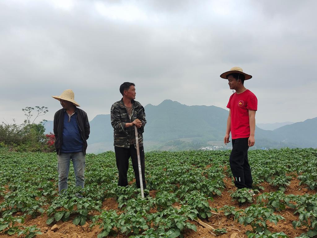 晌午时分,忙完手头农活儿,二十五岁的简宜伟坐在田埂上,和村民左奎一起交流马铃薯管护技术。此刻,务农半辈子的左奎像学生一样认真聆听。