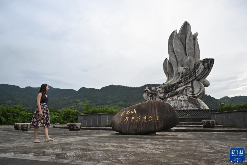 9月5日,新华社俄罗斯籍记者玛莎在福建武夷山下梅村的“武夷山万里茶道起点”雕塑参观。新华社记者 姜克红 摄