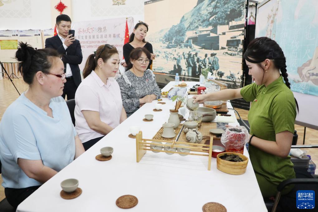 6月16日,人们在蒙古国东戈壁省赛音山达举行的“茶和天下·雅集”活动上品茶。新华社发(苏力雅摄)