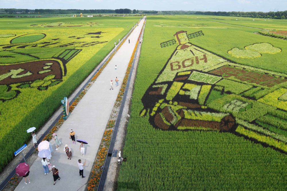 游客在北大荒集团闫家岗农场有限公司农业现代化示范区的稻田里游览(2023年8月10日摄)。新华社记者 王建威 摄