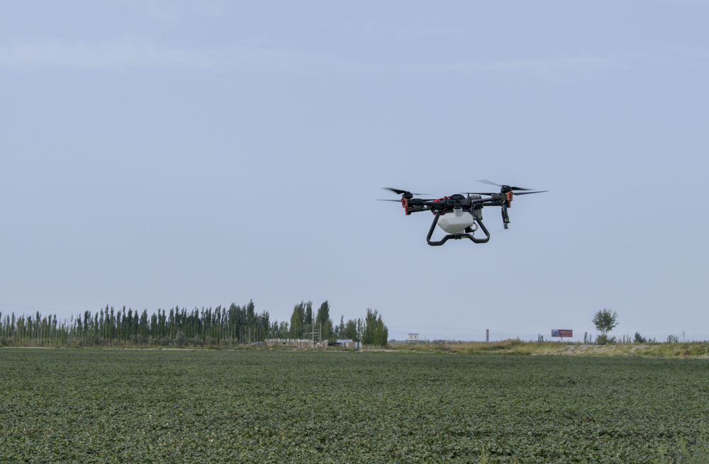 这是2023年9月18日在新疆巴音郭楞蒙古自治州尉犁县“超级棉田”拍摄的农业无人机。新华社记者 郝建伟 摄