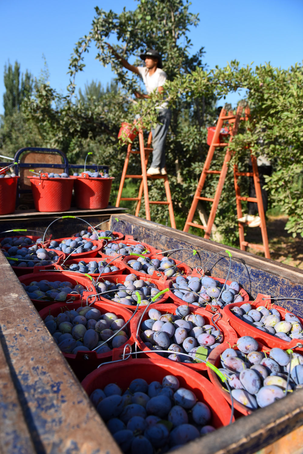 在新疆伽师县英买里镇巴格托格拉克村,果农在采摘新梅(2023年8月4日摄)。新华社记者 丁磊 摄