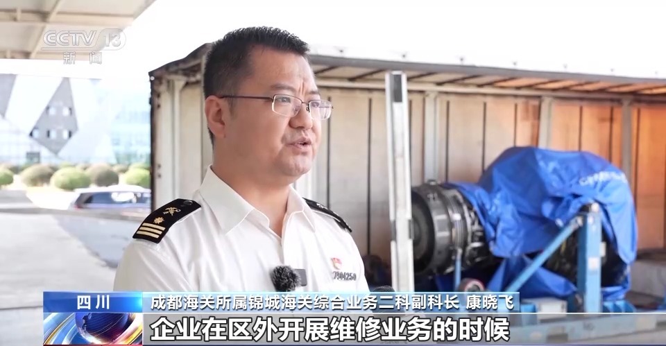 成都海关所属锦城海关综合业务二科副科长 康晓飞:这台就是已完成报税维修的发动机。企业在区外开展维修业务的时候,海关是对耗用的每个零部件,按照不同的税率来确定税款征收的,(现在)我们是按照根据他维修的成品来确定税率征收税款的,以我们区内这家最大的保税维修企业为例,它现在比原有的模式节约税款大概约3%。