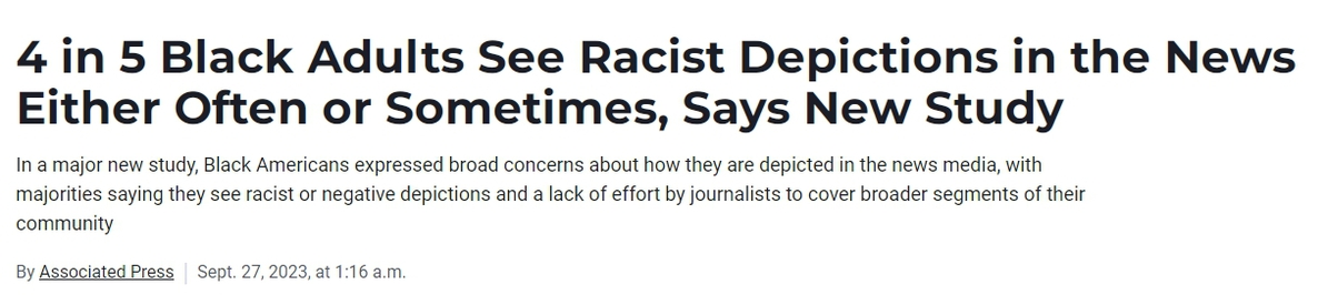 数据显示,80%非裔成年人表示,他们经常或者时而在新闻中看到针对自己种族的种族主义或种族漠视的描述。调查还发现,63%的受访者称,有关非裔群体的新闻报道往往比有关其他种族或族裔的报道更为负面。