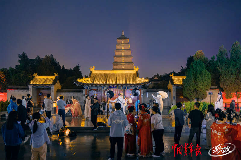 在西安大唐不夜城景区,身着华服的年轻人以大雁塔为背景,拍摄照片。中青在线记者 白杨/摄![]()
