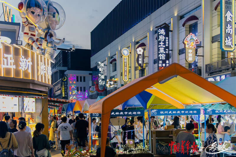 周末的傍晚,杭州武林夜市人流渐渐多了起来。实习生 汪苗/摄武林夜市党支部书记、总经理叶连忠说:“夜市是让人消解压力的地方,能够让大家慢下来。要充分释放‘潮经济’的潜力,更加适应年轻人的审美,让逛夜市不仅成为消费体验,也成为视觉享受。除此之外,夜市也可以成为年轻人相识交友、邂逅爱情的地方。”