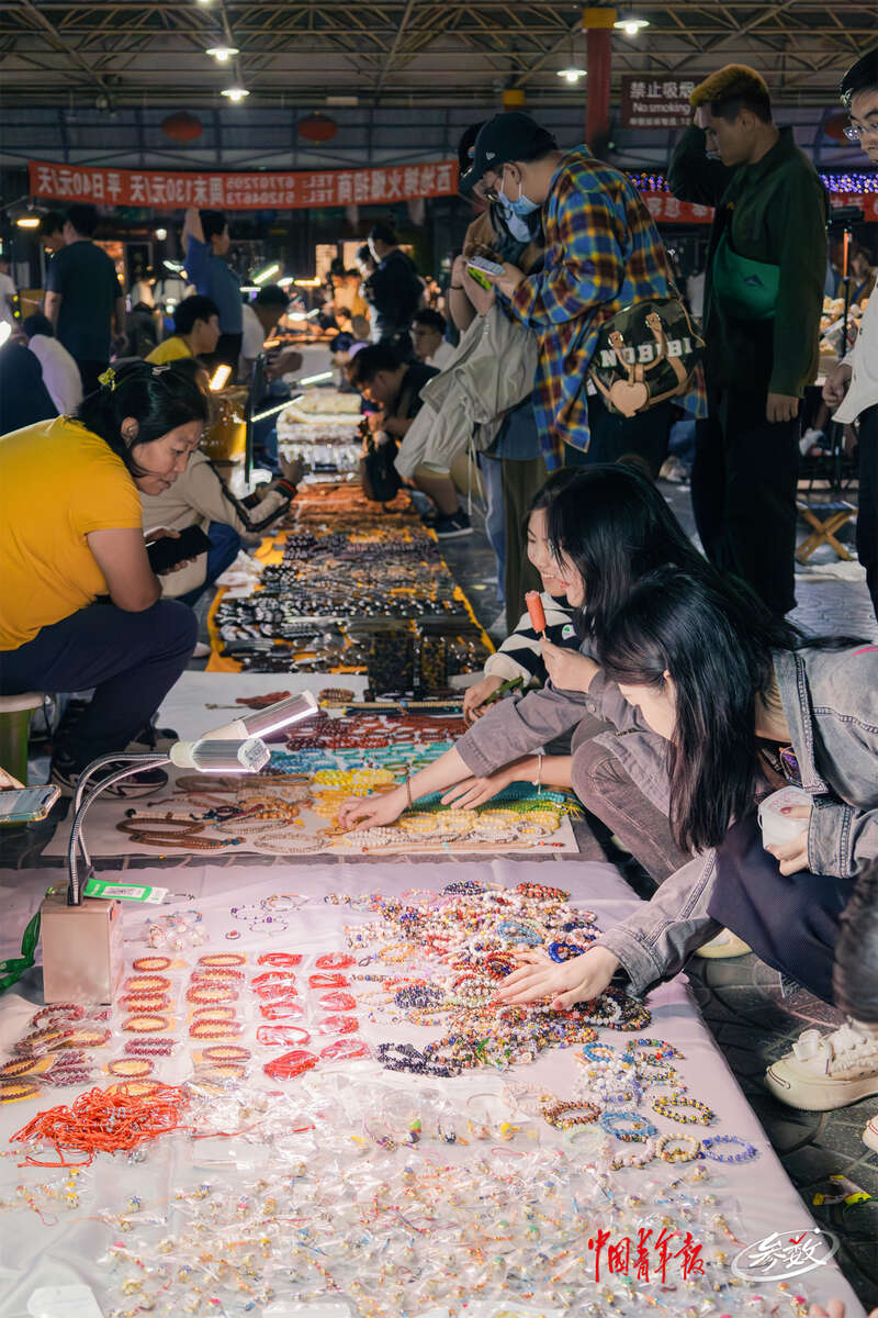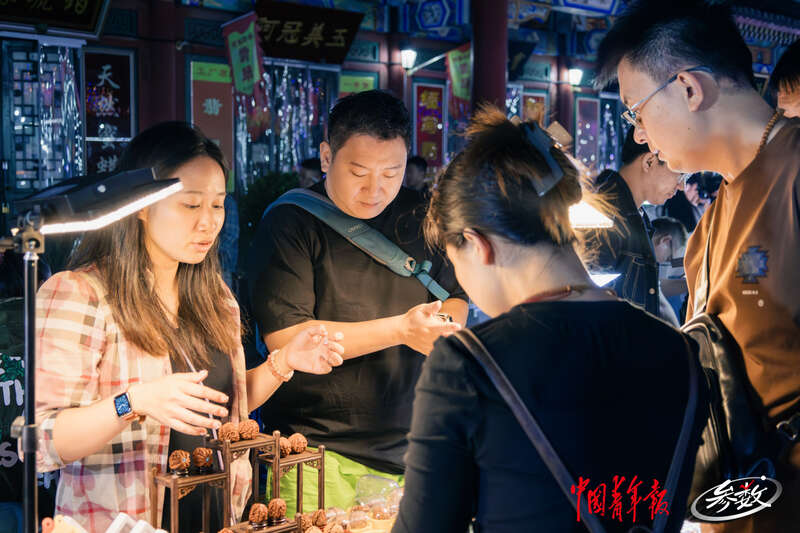 夜幕降临,北京潘家园旧货市场内的周三夜场开启,摊位上亮起了一盏盏照明的小灯,很多年轻人正在摊位前选购商品。实习生 邱岚/摄![]()