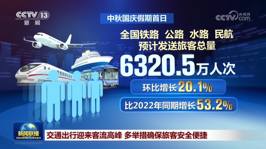 记者从交通运输部了解到,中秋国庆假期首日,全国铁路、公路、水路、民航预计发送旅客总量6320.5万人次,环比增长20.1%,比2022年同期增长53.2%。