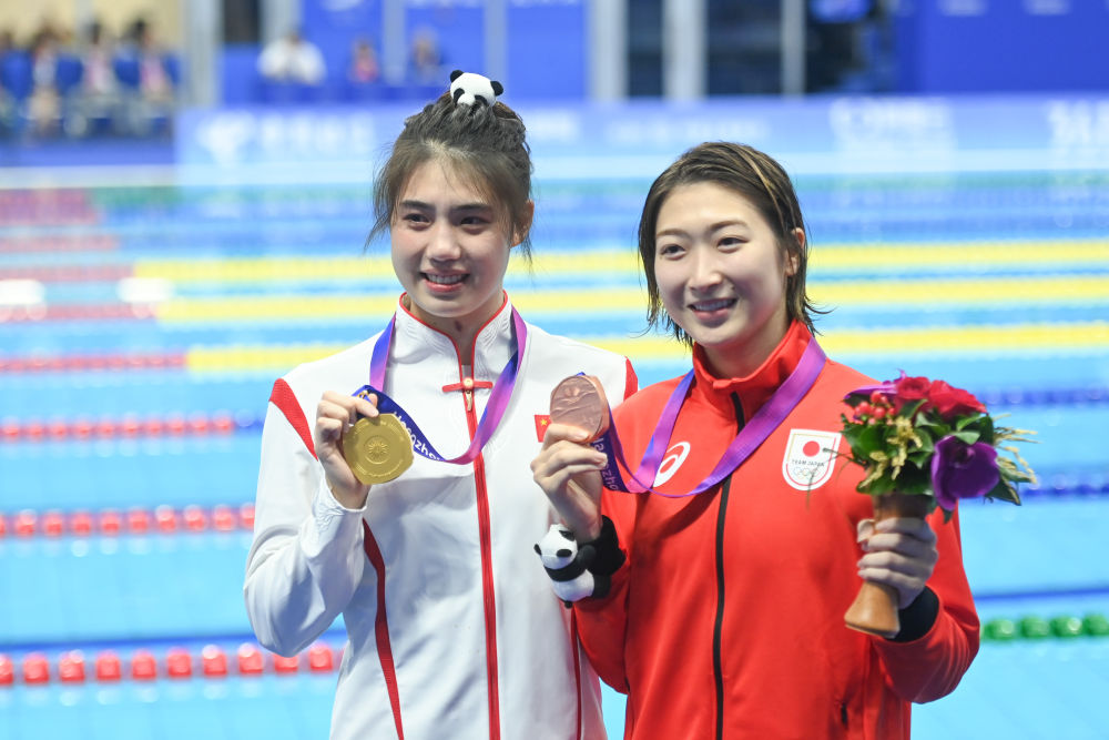 9月29日,冠军中国选手张雨霏(左)和季军日本选手池江璃花子在颁奖仪式后。当日,杭州亚运会游泳项目女子50米蝶泳决赛在杭州奥体中心游泳馆举行。新华社记者 黄宗治 摄