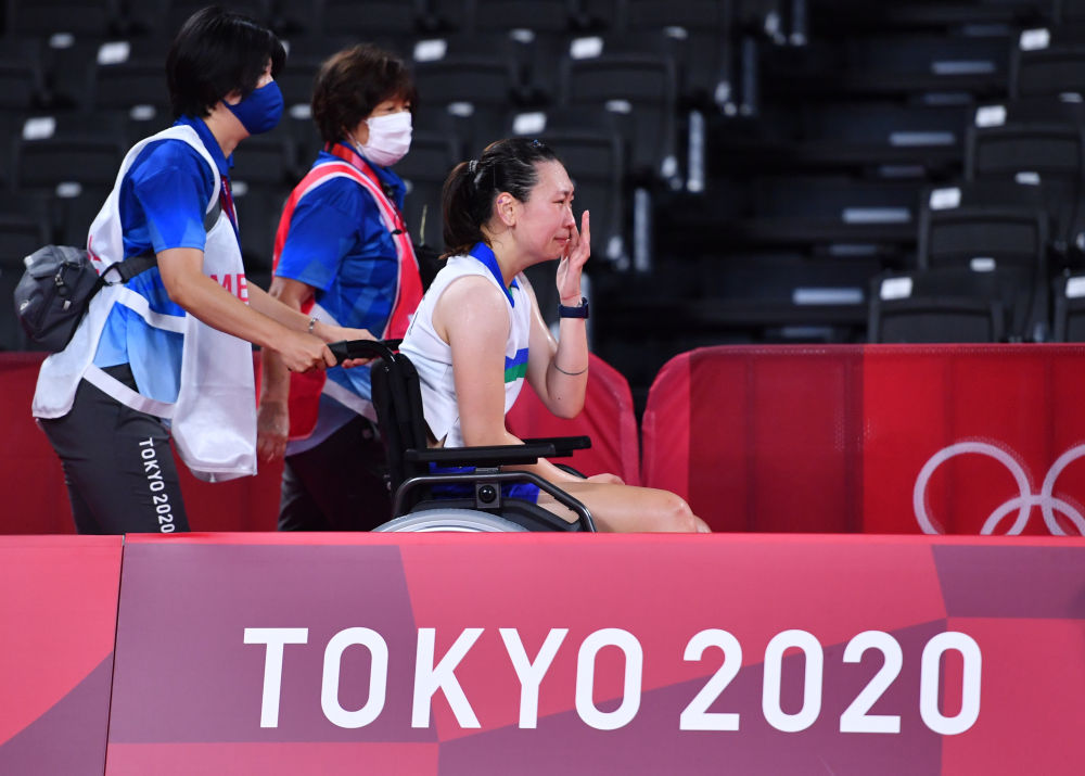 2021年7月29日,张蓓雯受伤退赛。当日,在东京奥运会羽毛球女单八分之一决赛中,美国选手张蓓雯受伤退赛,中国选手何冰娇晋级八强。新华社记者 朱峥 摄
