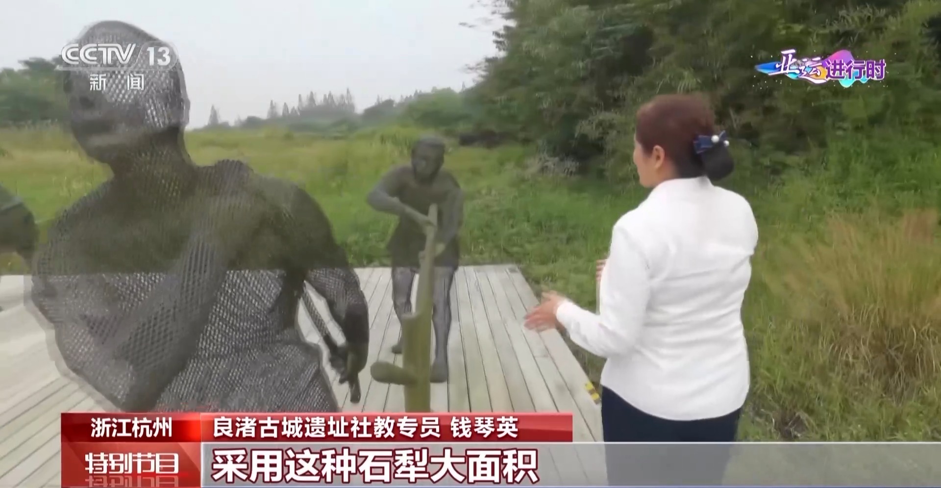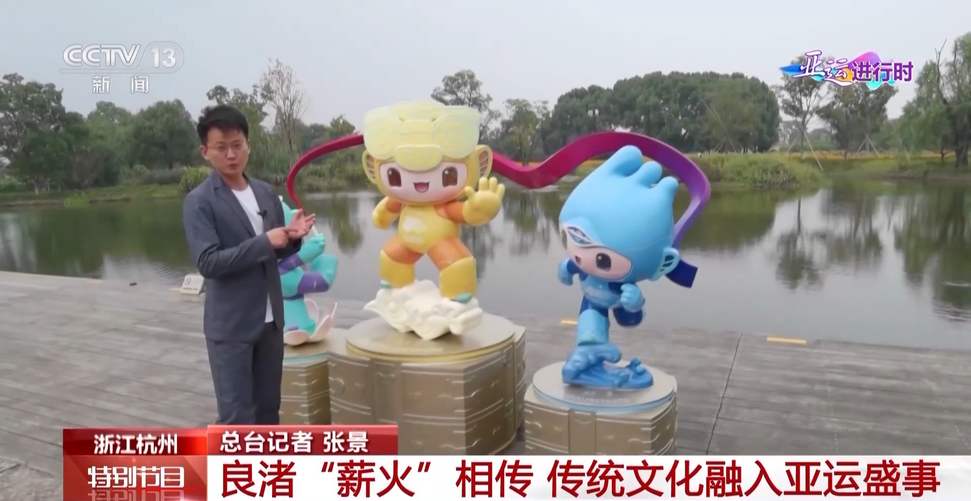 总台记者 张景:进入良渚古城遗址,首先迎接大家的是杭州亚运会的三个吉祥物。在中间的叫琮琮,良渚文物玉琮的琮,这是它名字的来源。头饰的设计灵感也来自玉琮上的神人兽面纹。它身上的颜色像稻子成熟后的金黄色,有一个好听的名字叫“丰收黄”,这个灵感也是来自良渚,因为这里在五千年前就已经开始大规模种植水稻了。