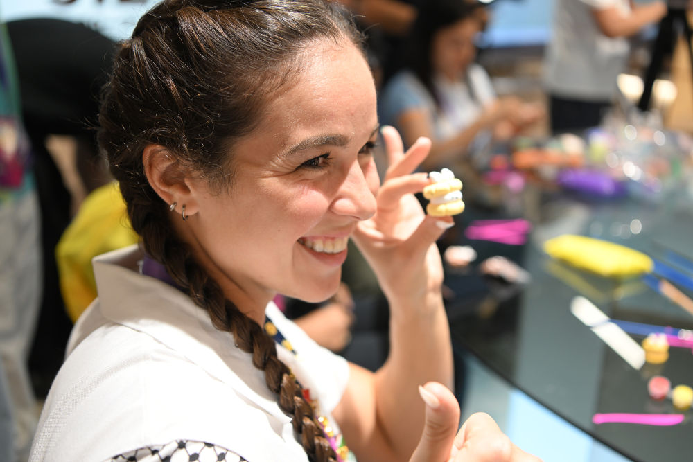 9月25日,一名日本运动员(右)在淳安赛区传统工艺体验坊和志愿者合影。