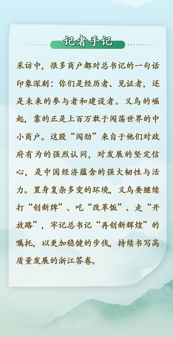 黄昌潮回忆说:“总书记把义乌每个点都说得很精准,他说从‘鸡毛换糖’变成一个‘世界超市’,我们从小孩茁壮成长,变成一个大汉。”