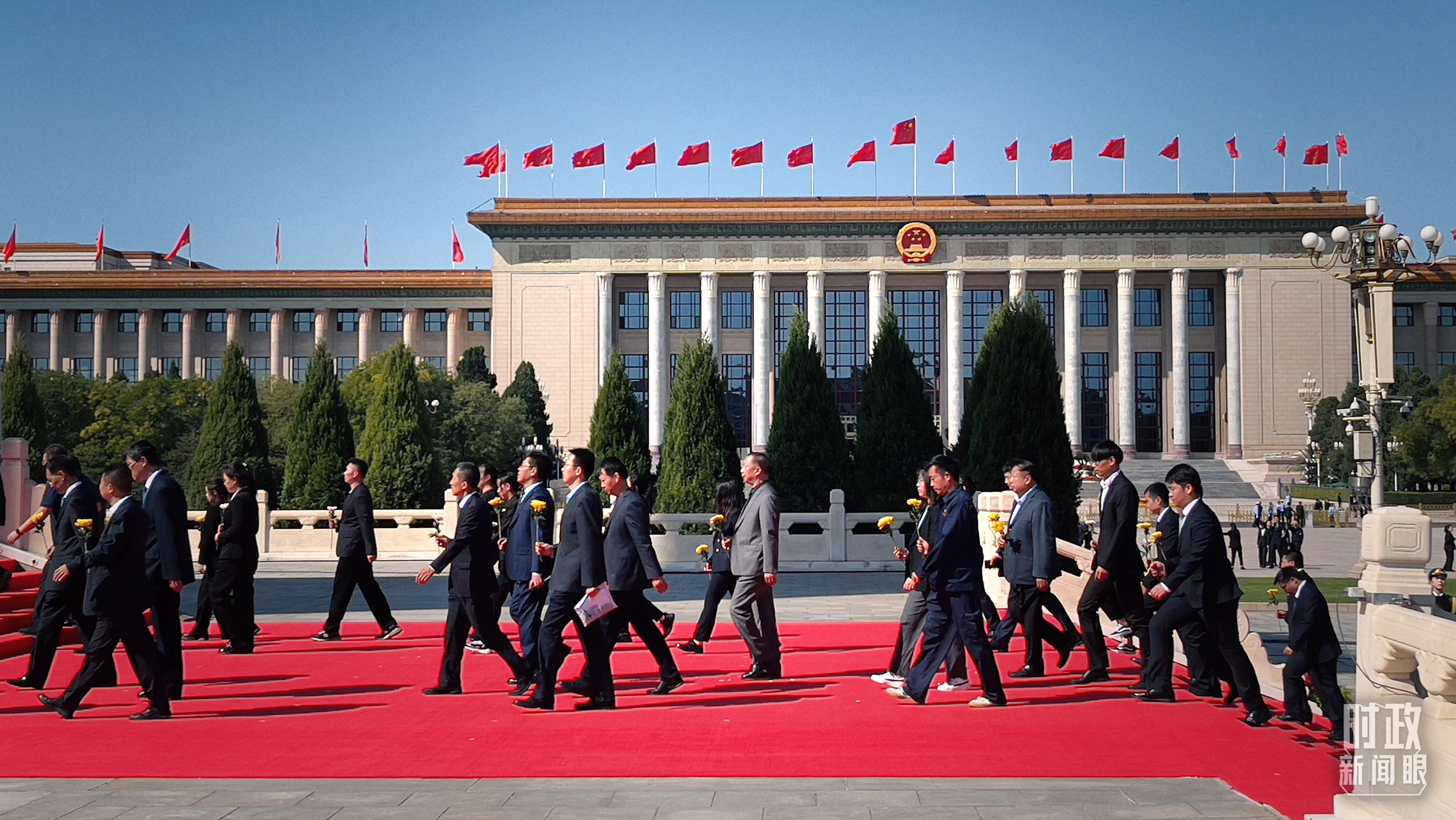 △首都各界代表依次走到纪念碑碑前,献上手中鲜花。(总台央视记者段德文、鄂介甫拍摄)