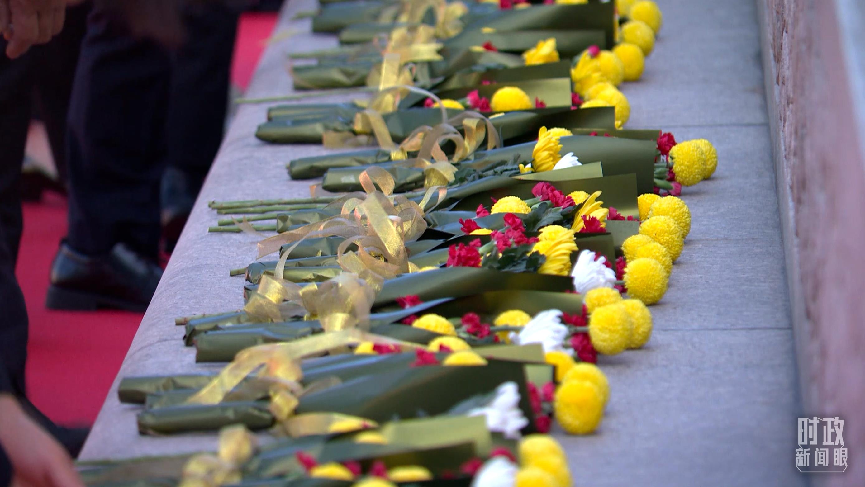 △仪式现场共有18个由白菊等鲜花组成的花环。(总台央视记者赵化拍摄)