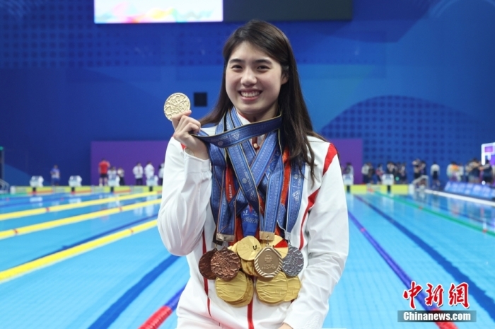 9月29日晚,杭州第19届亚运会游泳比赛落下帷幕,张雨霏展示其在福冈游泳世锦赛、第31届世界大学生夏季运动会以及杭州第19届亚运会获得的奖牌。