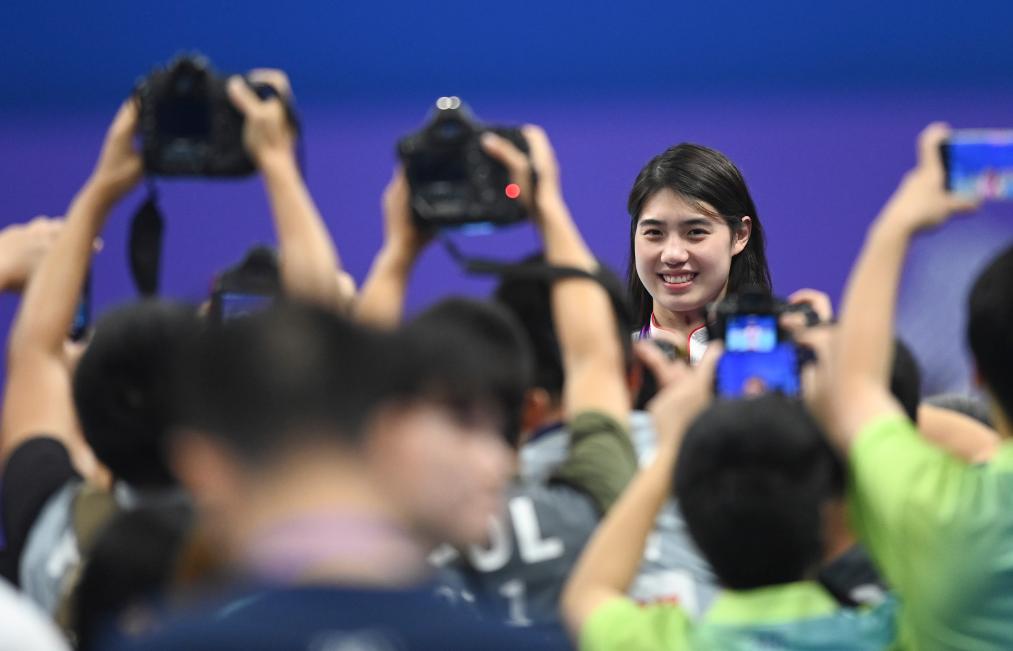 9月29日,中国选手张雨霏在赛后留影。新华社记者 黄宗治 摄