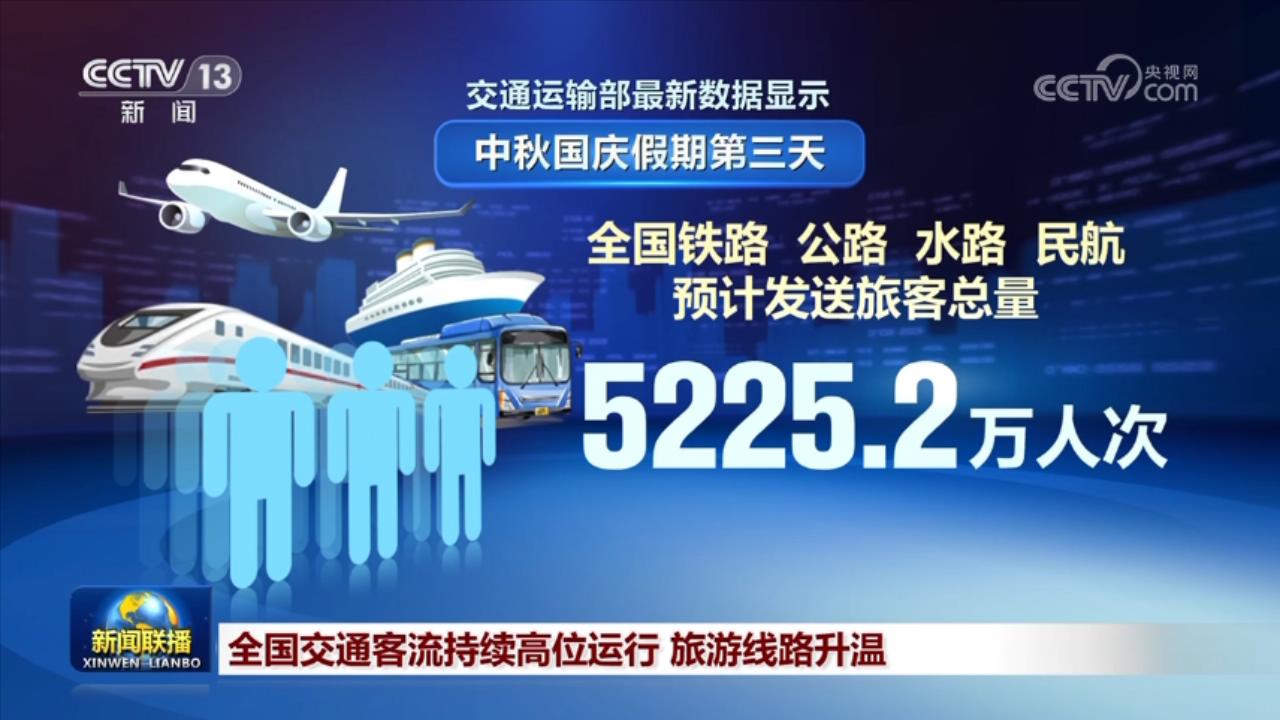 央视网消息(新闻联播):交通运输部最新数据显示,中秋国庆假期第三天,全国铁路、公路、水路、民航预计发送旅客总量5225.2万人次。出行热度不减,长三角铁路部门10月1日在多个热门旅游城市间加强运力增补。多地铁路局还结合旅游区域特色,开通旅游专列。