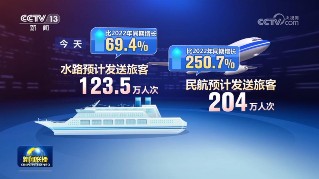 今天,水路预计发送旅客123.5万人次,民航预计发送旅客204万人次,比2022年同期分别增长69.4%和250.7%。