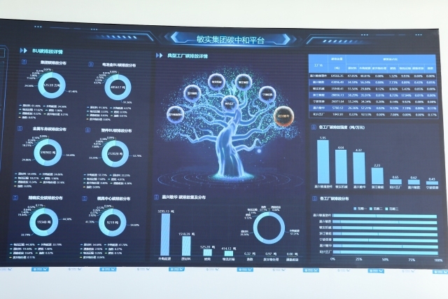 在敏实集团展厅的一块大屏上,实时显示着整个厂区的用能排碳、机器状态、在岗员工等方方面面的生产数据,甚至连食堂近半年最受欢迎的菜品排行都包含其中。