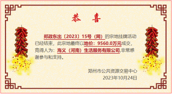 郑政东出〔2023〕15号(网)被海义(河南)生活服务有限公司9560万元摘得