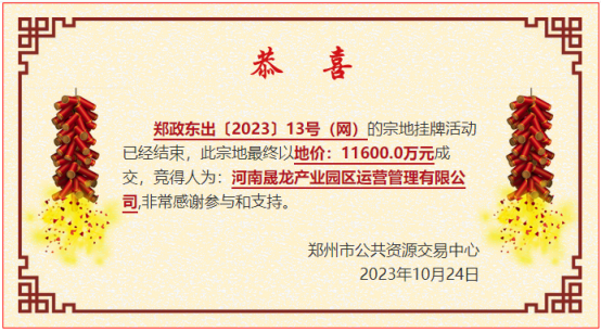 郑政东出〔2023〕13号(网)地块被河南晟龙产业园区运营管理有限公司11600万元摘得