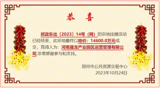 郑政东出〔2023〕14号(网)地被河南晟龙产业园区运营管理有限公司14600万元摘得