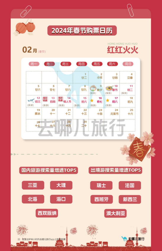 去哪儿大数据研究院分析:“2024年春节旅游出行会有三个新特点:一是春节客流量将明显增加;二是出行高峰将被拉平,大家有了错峰出行的规划空间;三是用户出游总距离将会延长,不少旅客可选择多玩一个目的地。”