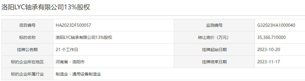 【大河财立方消息】10月31日消息,据河南中原产权交易有限公司,洛阳LYC轴承有限公司13%股权公开挂牌转让,底价3.54亿元,挂牌截止日期为2023年11月17日。