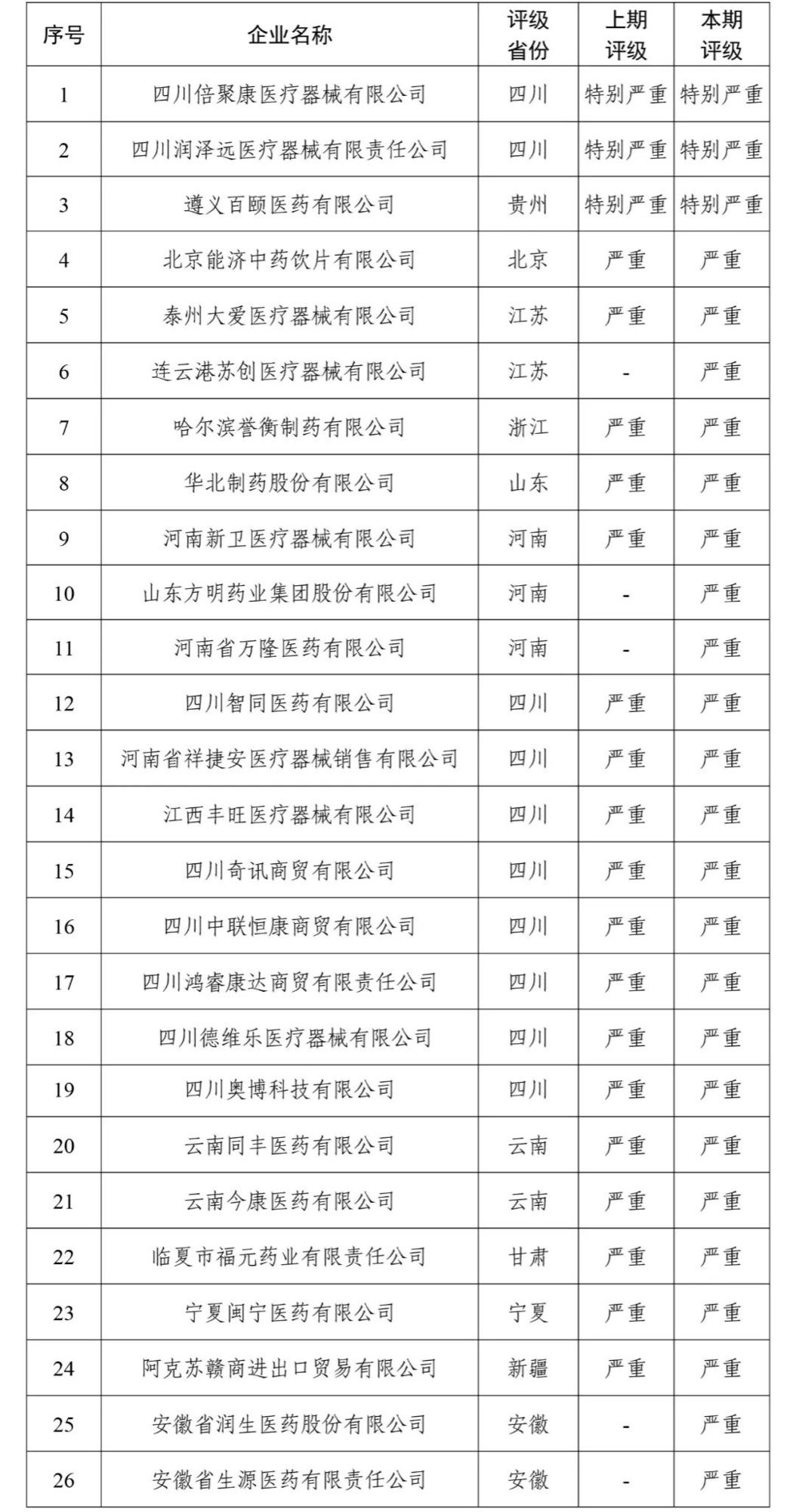 央广网北京11月20日消息(记者 吴佳怡)今天,受国家医疗保障局委托,国家医疗保障局医药价格和招标采购指导中心汇总了2023年9月30日各省份评级为“特别严重”和“严重”失信的医药企业情况,公告如下。
