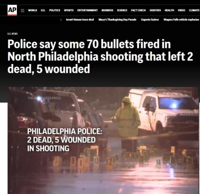 中新网11月23日电 据美联社报道,当地时间21日,美国费城北部发生枪击事件。当地警方22日确认,枪手至少发射了70发子弹,导致2名男子丧生,另有5人受伤。目前,警方还未逮捕嫌疑人。