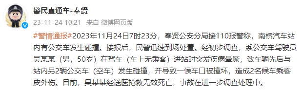 2023年11月24日7时23分,奉贤公安分局接110报警称,南桥汽车站内有公交车发生碰撞。接报后,民警迅速到场处置。经初步调查,系公交车驾驶员吴某某(男,50岁)在驾车(车上无乘客)进站时突发疾病晕厥,致车辆先后与站内另2辆公交车(空车)发生碰撞,并导致一候车口被撞坏,造成2名候车乘客皮外伤。目前,吴某某经送医抢救无效死亡,事故在进一步调查处理中。