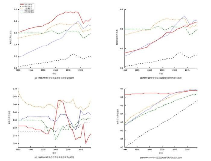 为此,在本项研究中,合作团队基于1990-2019年中亚五国的气象、农业、经济数据,利用“经济-气候”(C-D-C)模型从粮食可用性、可获得性、可利用性、稳定性等方面综合研判中亚五国的粮食安全现状,深入分析了气候变化和极端气候事件对五国粮食安全的影响与机制,并预估了未来不同气候情景下五国粮食安全的发展趋势。