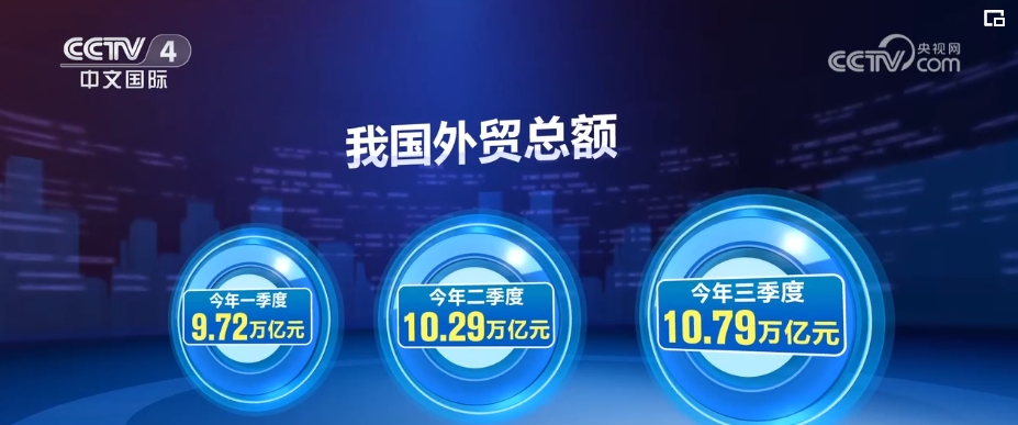 2023年一、二、三季度,我国外贸总额分别为9.72万亿元、10.29万亿元和10.79万亿元,外贸规模逐季抬升。
