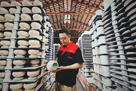 为了配合跨境平台,工厂也正变得越来越年轻。图为陶瓷工厂80后厂长在检查产品情况。张建/摄