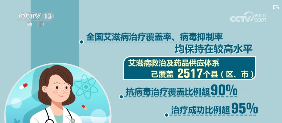 全国艾滋病治疗覆盖率、病毒抑制率均保持在较高水平。艾滋病救治及药品供应体系已覆盖2517个县(区、市),抗病毒治疗覆盖比例超90%,治疗成功比例超95%。