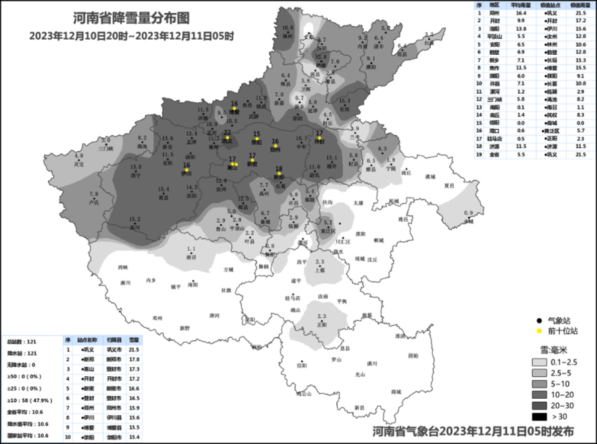 大河报•豫视频记者从河南省气象局获悉,根据河南省气象台监测显示,12月10日20时至11日05时,我省西部、北中部出现大雪,郑州、洛阳、济源、焦作、新乡东部和南部、开封西部、许昌北部、平顶山北部部分县市出现暴雪,巩义局地大暴雪;其他县市为雨夹雪或小到中雨。降水量前三位:巩义22.3毫米、嵩县19.7毫米、尉氏18.8毫米;降雪量前三位:巩义21.5毫米、新郑17.8毫米、嵩山17.3毫米。
