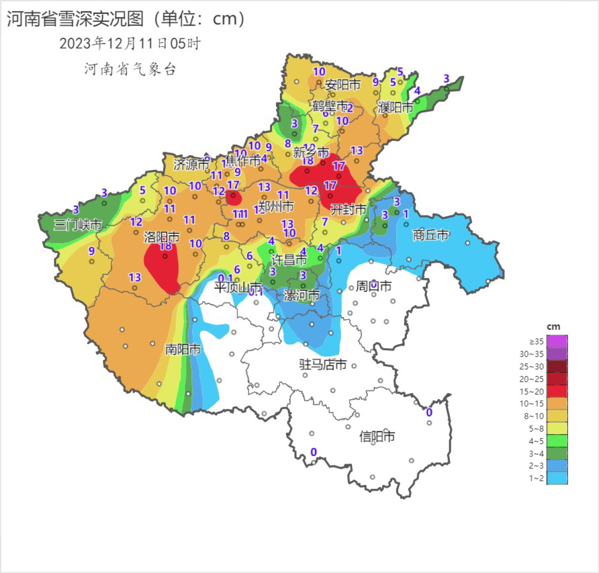 积雪深度:11日05时,西部、北中部大部分县市10厘米以上,新乡南部、郑州西部、开封西部、洛阳南部局地15厘米以上。积雪深度前三位:嵩县18厘米、原阳18厘米、巩义17厘米。