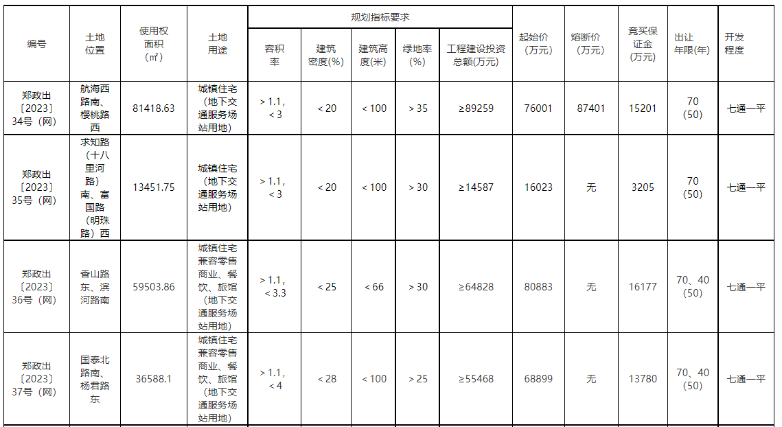 郑政出〔2023〕37号(网)地块位于国泰北路南、杨君路东;使用权面积36588.10平方米,土地用途为城镇住宅、零售商业、餐饮、旅馆,容积率小于4,建筑高度小于100米。楼面价4708元/㎡,起始价为68899万元。